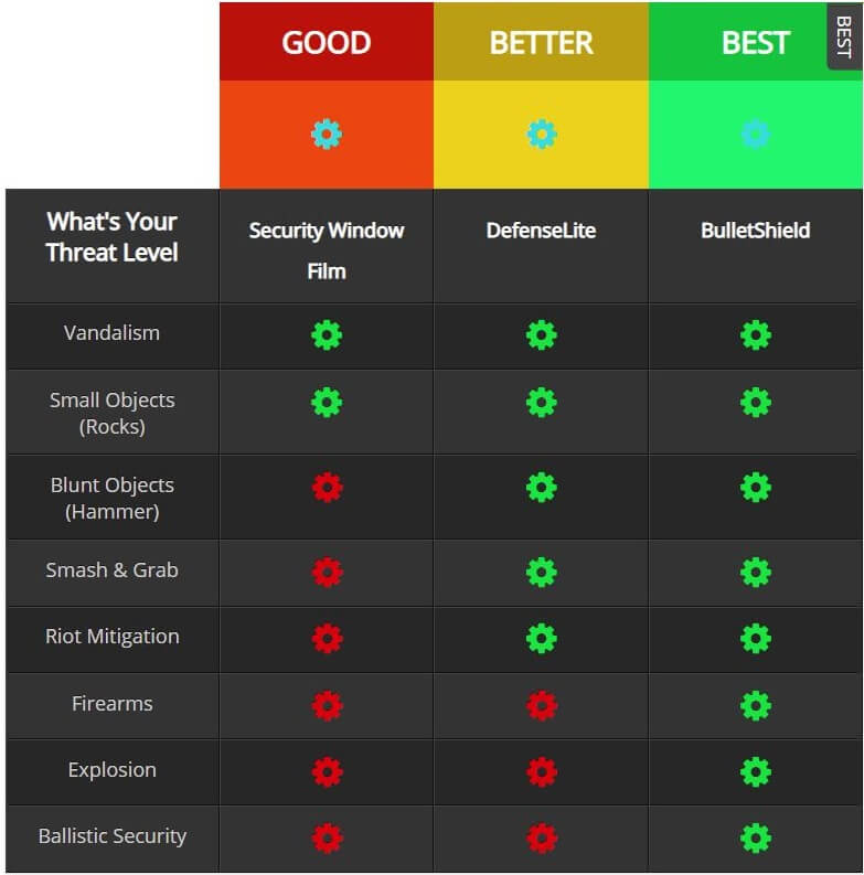 Notes: Each DefenseLite system is custom fabricated based on existing glazing conditions and installed by certified installers.